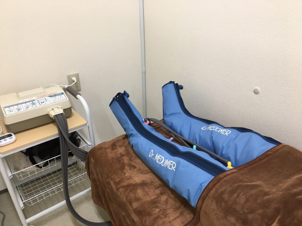 簡単に説明しますと、座位や寝た姿勢で、両脚に空気圧でのポンプをし、血流や疲れを促す作用がある治療器具です。