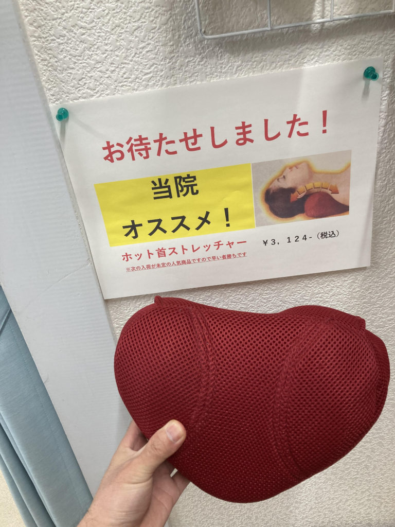 以前ストレッチポールと一緒に紹介させていただいたホット首ストレッチャーで、実際に紹介した患者様がお求めになられ、入荷待ちでした。数に限りがあるようで、約1か月かかってやっといくつか確保できました。ご予約いただいていた分はお渡しできますので、それでも残りわずか!早い者勝ちです。