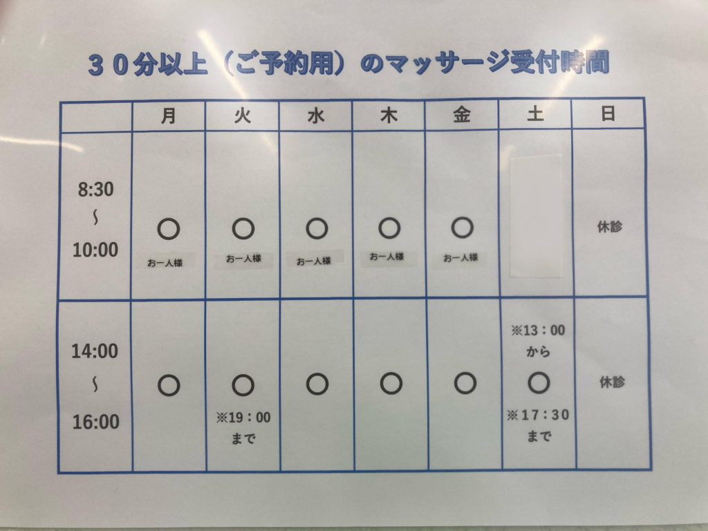 尚、朝の時間帯で10時までにマッサージを終える時間であれば受付します。