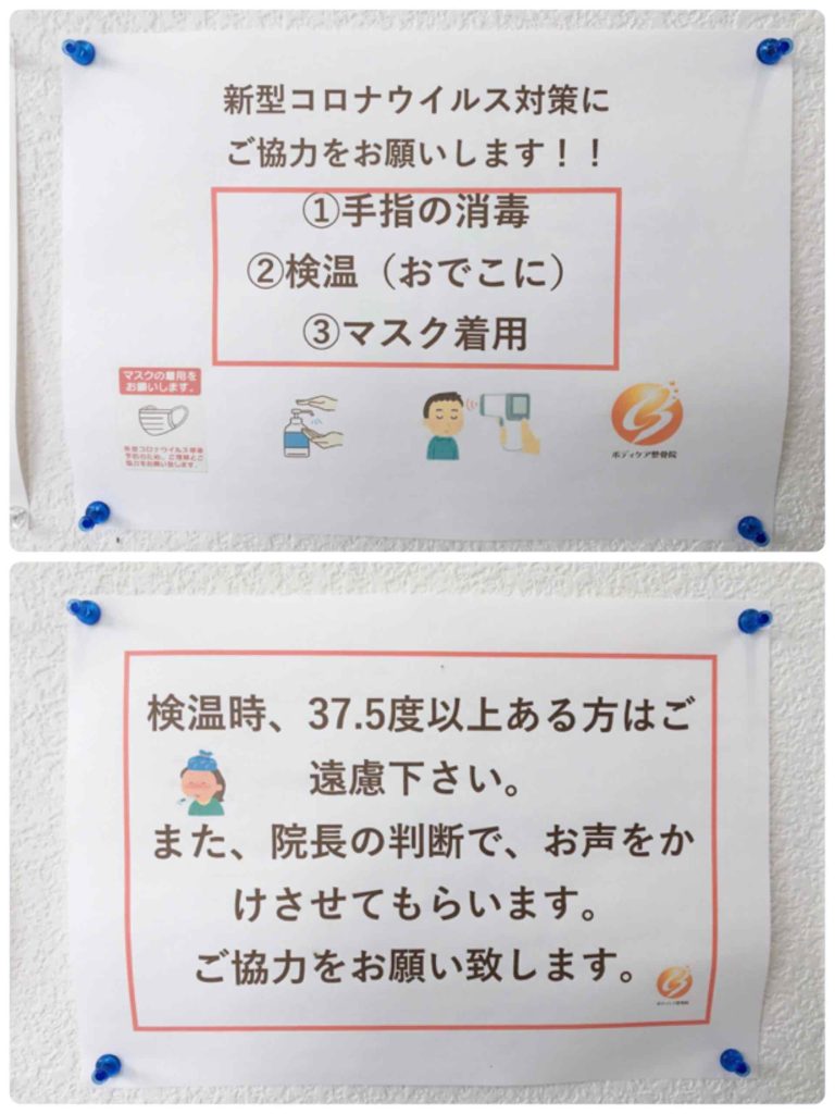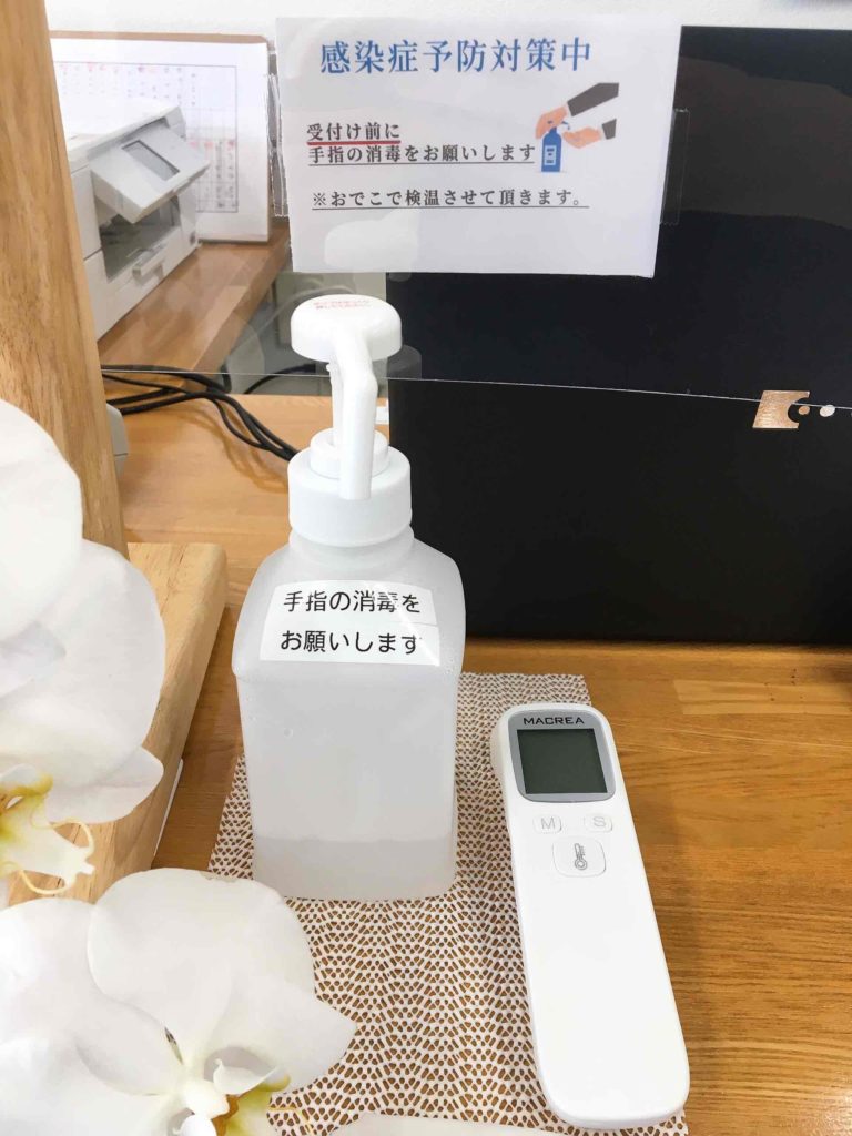 当院では皆様が安心できる空間作りのために適時換気を行い、患者様には来院時の手指の消毒、検温、マスク着用のご協力をお願いしております。※検温時に37.5度以上ある方はご遠慮させて頂いております。