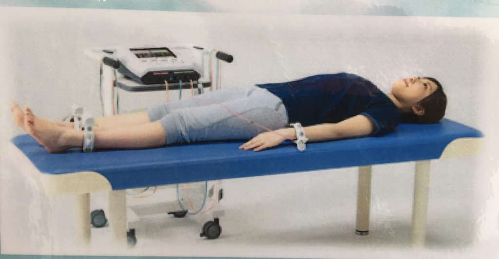 ベッドに横になっていただき両手足首にカチャっとクリップをはめていただくだけ。