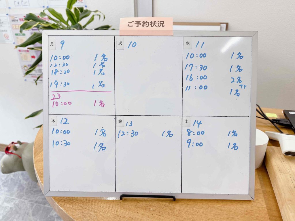 今週のご予約状況をお知らせいたします。明日10日や、午後の時間帯が比較的空いています。