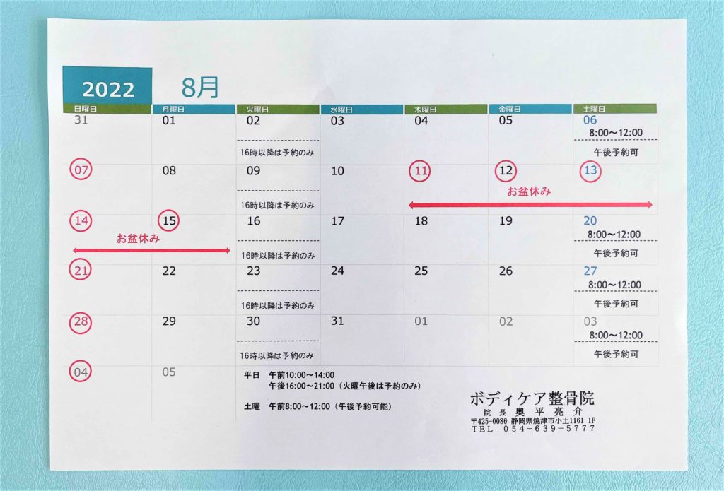 8月は夏季お休みがありますのでご確認のうえ、ご予約ご来院ください。
