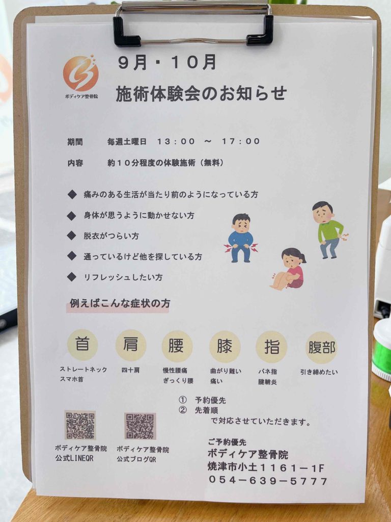 さて、当院では〈9月・10月施術体験会〉を実施いたします。