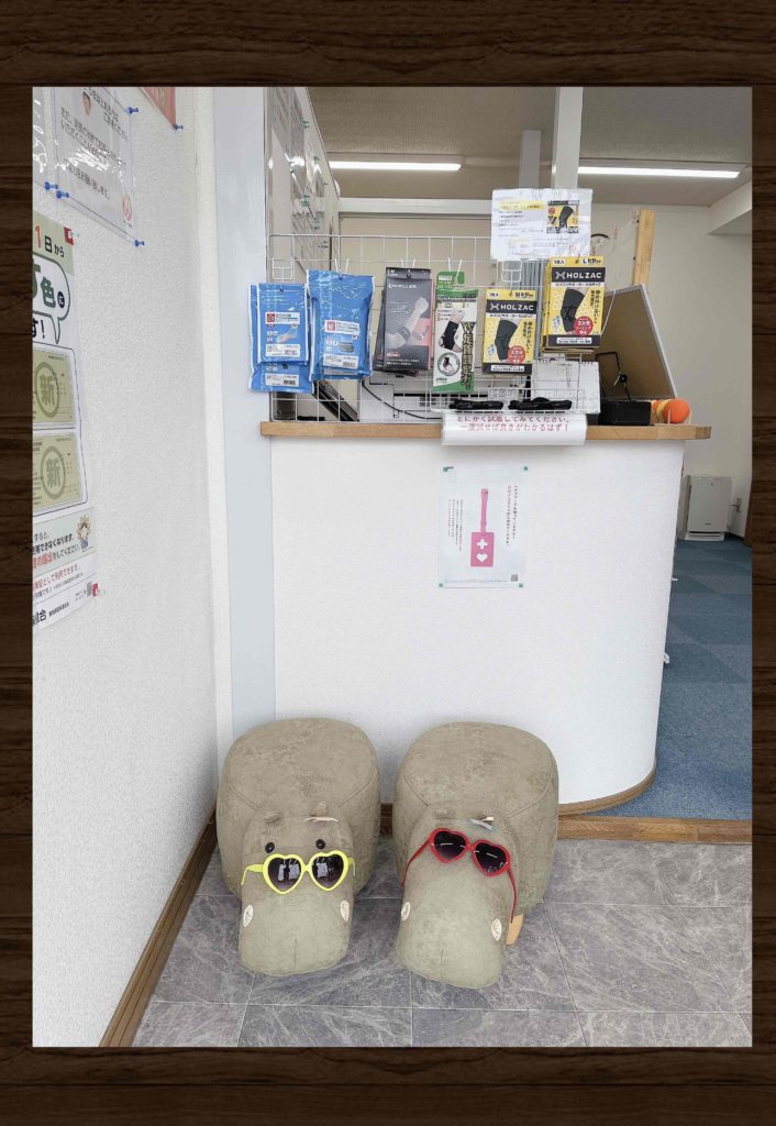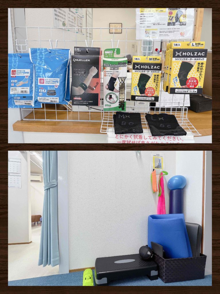 また、入口ドア入ってすぐの受付横には、少しですがサポーターやヒップベルトなどを販売しております。試着もできますので是非ご覧ください。