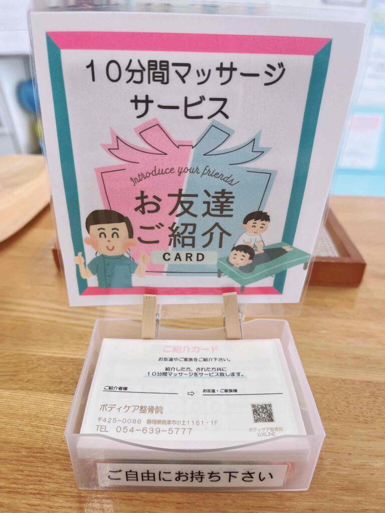 紹介してくださった方とされた方、共に10分間マッサージをサービス致します。