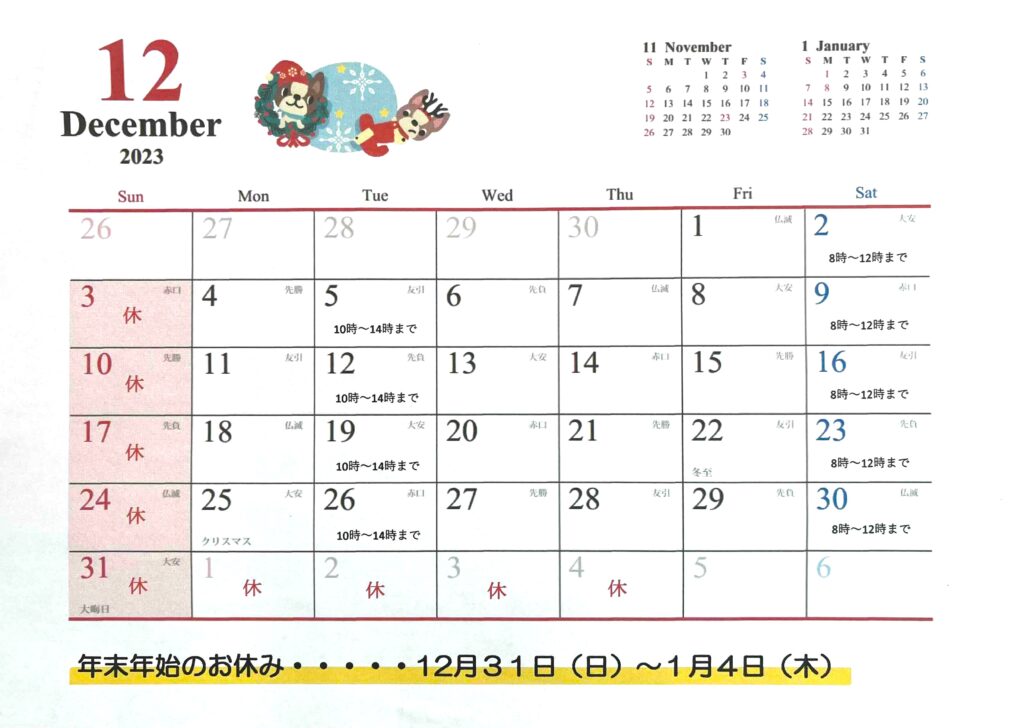 12月の当院のお休みは下記のとおりです。