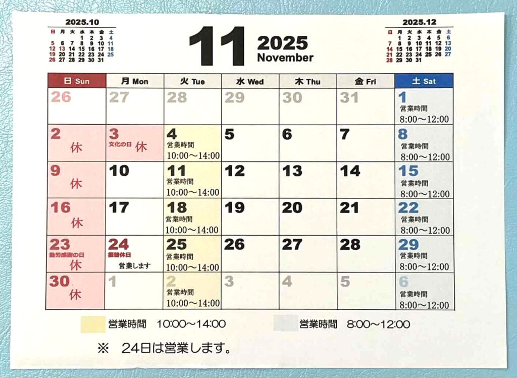 11月のお休みをお知らせいたします。